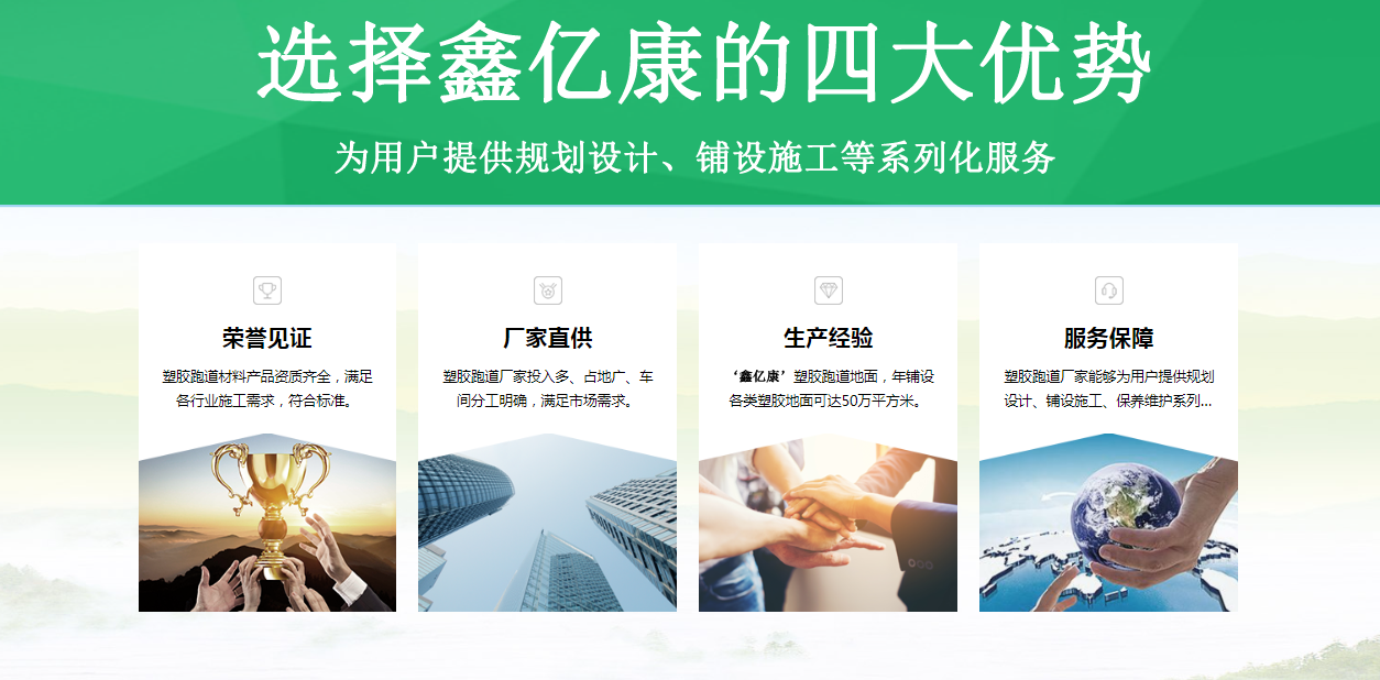 鑫億康(山東)體育產業發展有限公司是業內一家塑膠跑道材料的生產企業。公司經營范圍:塑膠跑道,全塑型塑膠跑道,混合型塑膠跑道,透氣型塑膠跑道,EPDM塑膠跑道廠家銷售及鋪設;體育用品及器材銷售、安裝?! 」緭碛袑I的生產及研發團隊和專業的銷售管理精英團隊,一直致力于產品的開發和業務的拓展,產品暢銷全國各個省市,遠銷東南亞地區、歐美等國家。卓越的品質,周到細致的服務,使我們取得為眾多生活小區、市政單位、物業公司、學校、工廠等單位提供優質產品的機會,產品色澤鮮艷,美觀大方,品種齊全,材質多樣化,并贏得了良好口碑,多次獲得好評和表彰?! ∑髽I性質:涉足建筑業,具有多項資質證書,是集研發、項目管理、設計、檢測、加固施工、咨詢服務于一體的綜合性科技型企業,通過為業主提供品質卓越、專業誠信的服務,來贏得信譽并滿足社會要求?! 》諆热荩洪L期致力于建筑領域中發展,從項目的規劃到操作運行,為業主提供從工程項目管理、工程結構設計、房屋質量檢測、幕墻檢測、司法鑒定、抗震鑒定、工程檢測、工程測繪、特種工程加固、綜合改造加固、工程監理等系統而專業化的服務,包括項目生命周期中的每一個步驟。  管理平臺:致力于管理的規范化和精細化,為業主提供性價比更高的服務。公司按照國際ISO9000質量標準和國家MA計量標準實事工程...